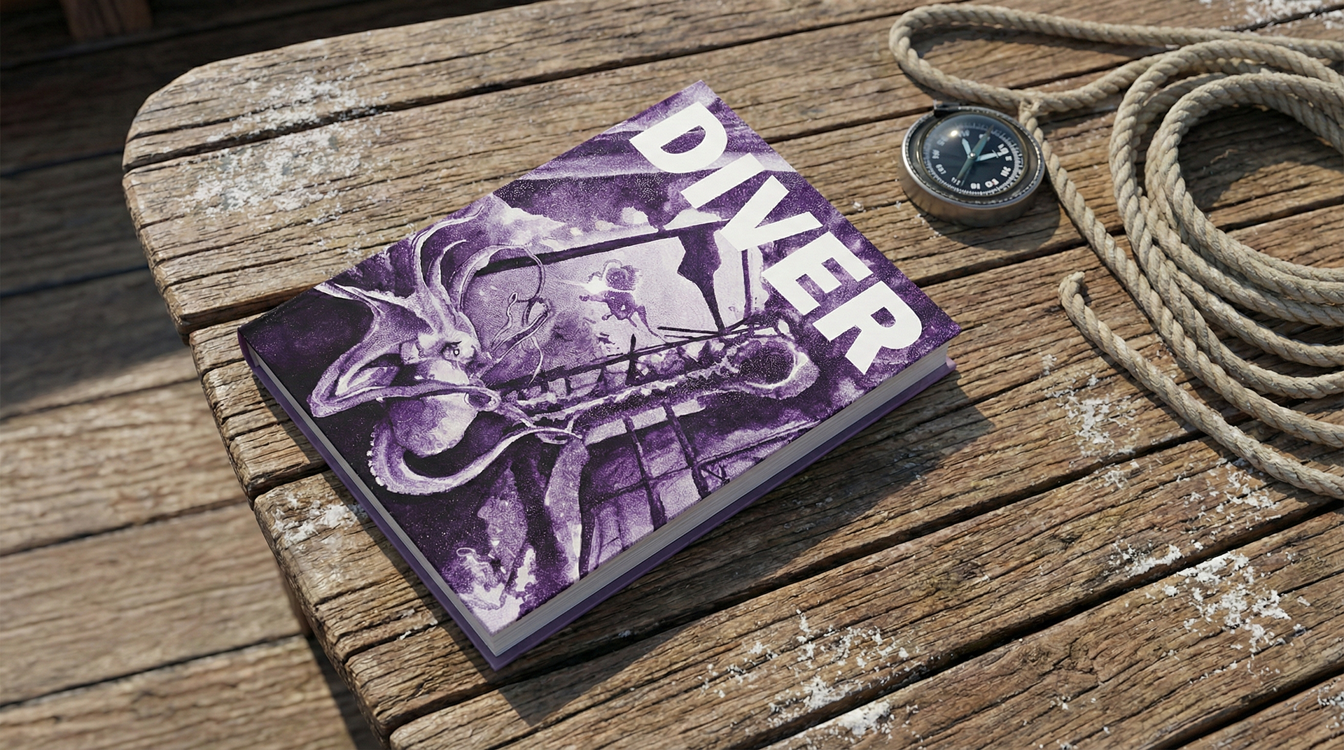 This is a book cover illustration for a story about a diver who discovers and explores a shipwreck.