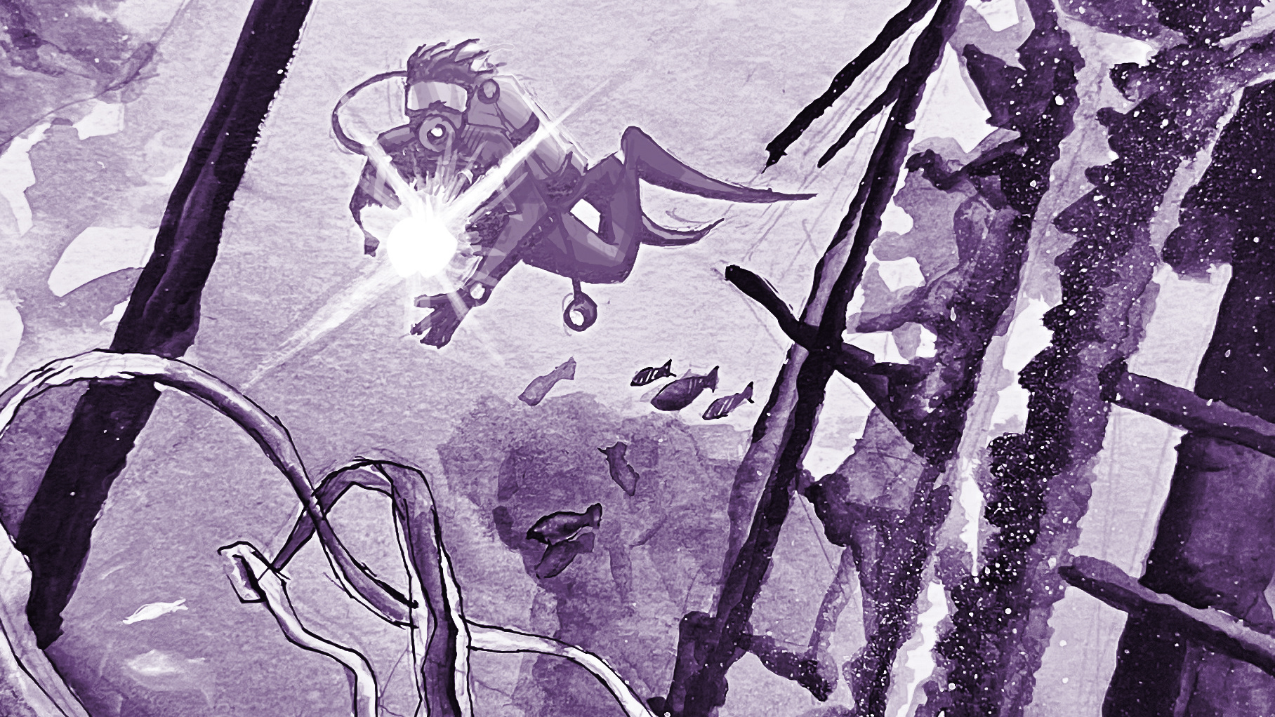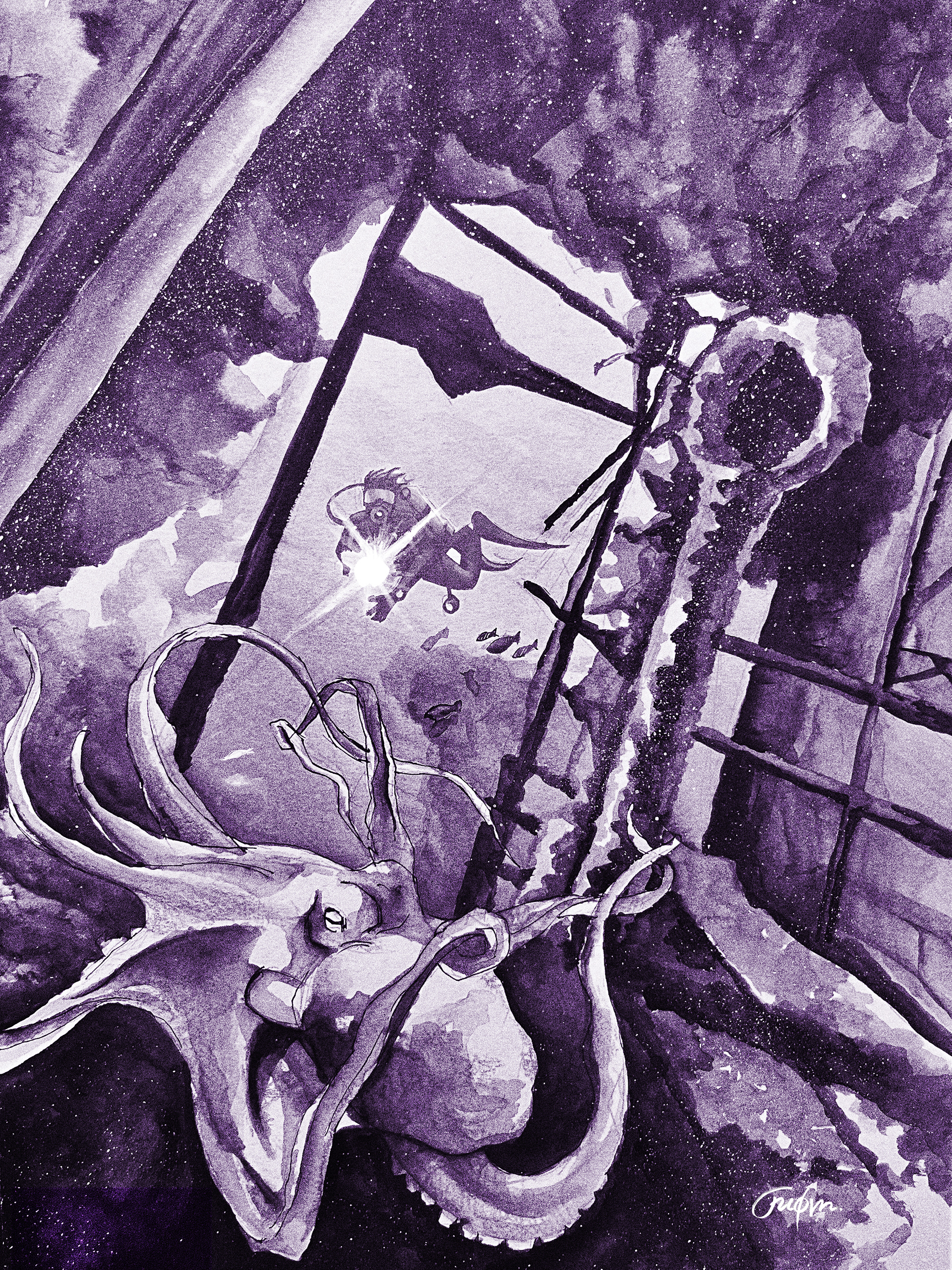 This is a book cover illustration for a story about a diver who discovers and explores a shipwreck. Original A4 acrylic painting.